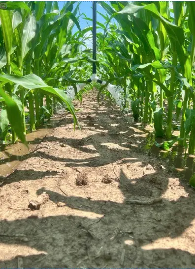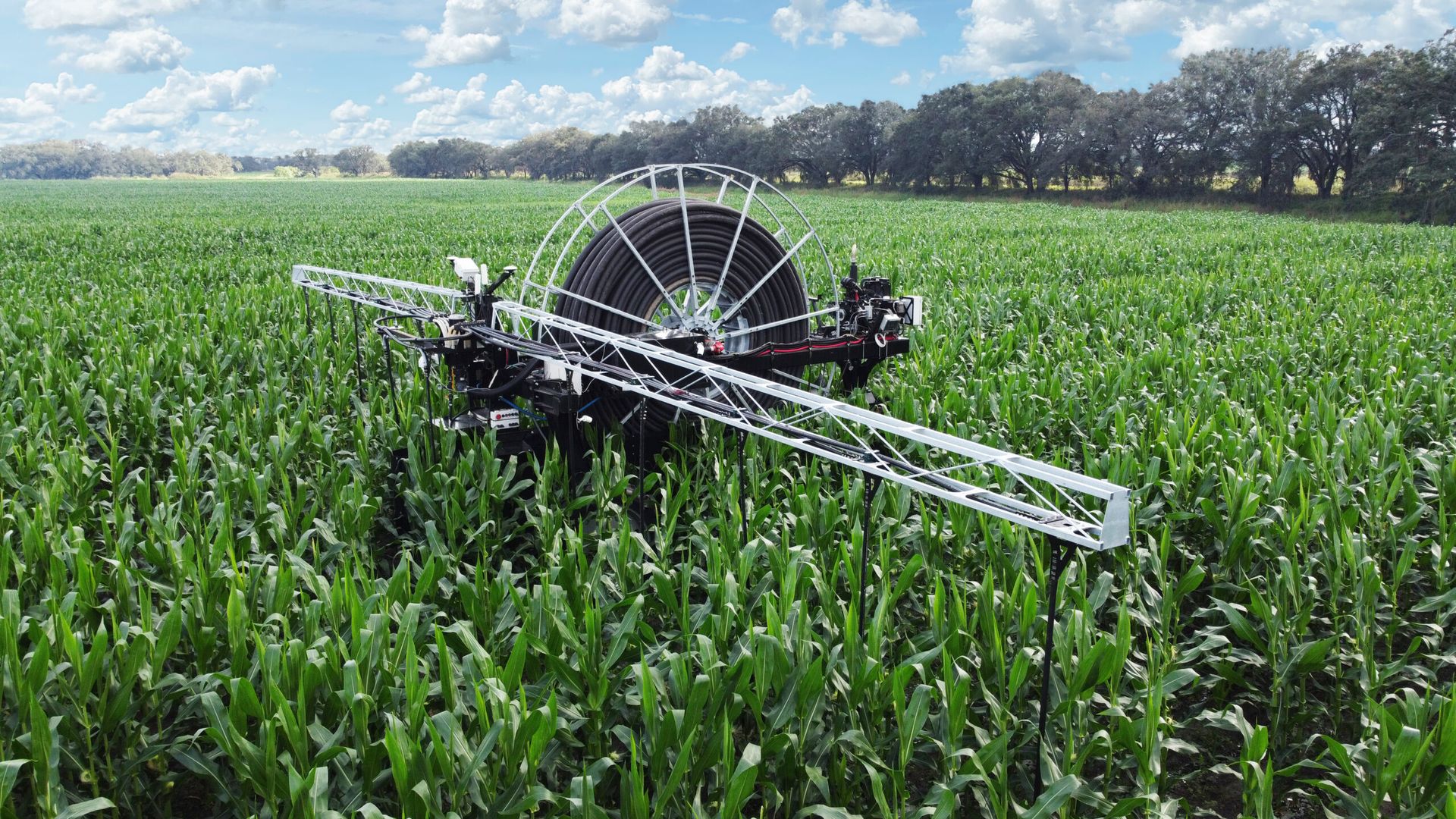 Water is applied through a boom using either Y-DROP or flat-fan style hoses, with drop options tailored to your crop – use Y-DROP for row crops like corn and soybeans, flat-fan for solid-seeded crops like small grains or alfalfa, or custom drops for specialty crops like potatoes and onions. 360 RAIN operates efficiently with an average flow rate of 150–200 gallons per minute. As the machine moves down the field, a vertical hose reel with advanced sensors lays out hose along a backbone path and then retrieves it on the return pass. A manifold distributes water and nutrients to each drop, applying them in a 15-inch band directly over the root zone, significantly reducing evaporation compared to pivots and traveling guns.