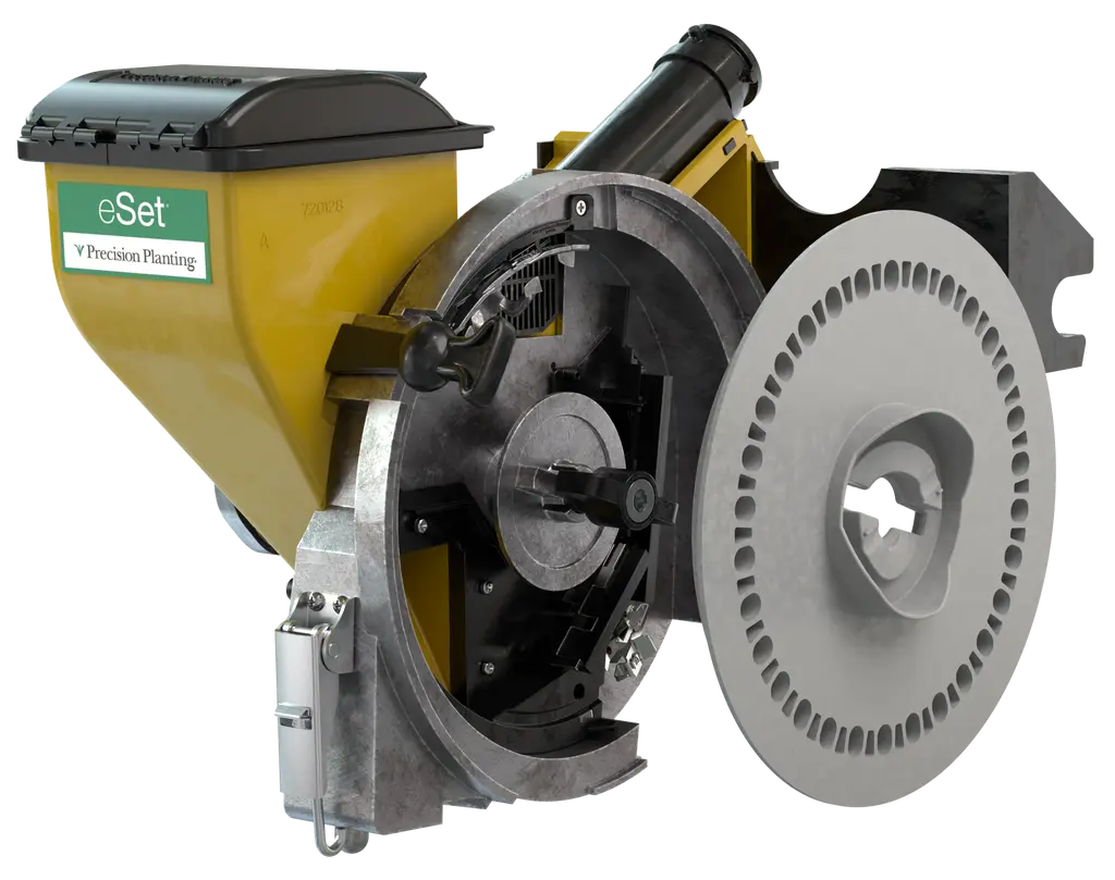 John Deere vacuum meters need adjustment to properly singulate seeds, resulting in skips and multiples. The eSet meter is a retrofit system that goes inside of a John Deere vacuum meter and uses a flat disk without cells, paired with a floating singulator that doesn't need adjustments. Simply set your vacuum, fill the planter with seed, and go.